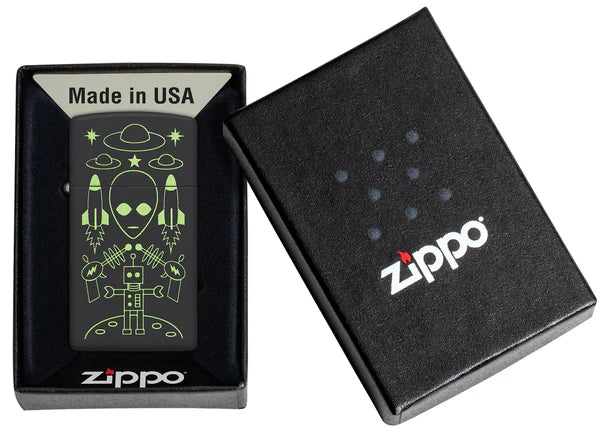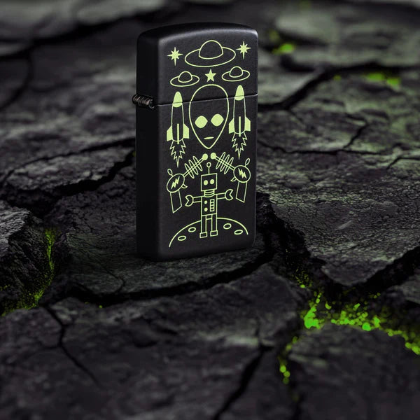 Ez a Slim® matt fekete öngyújtó békés szándékkal érkezik! A játékos Color Image dizájn egy lebegő földönkívüli fejet és egy holdjáró robotot ábrázol, amelyeket repülő csészealjak, rakéták és sugárfegyverek kavalkádja vesz körül. Díszdobozba csomagolva érkezik. Az optimális teljesítmény érdekében töltse fel Zippo öngyújtó töltőfolyadékkal!