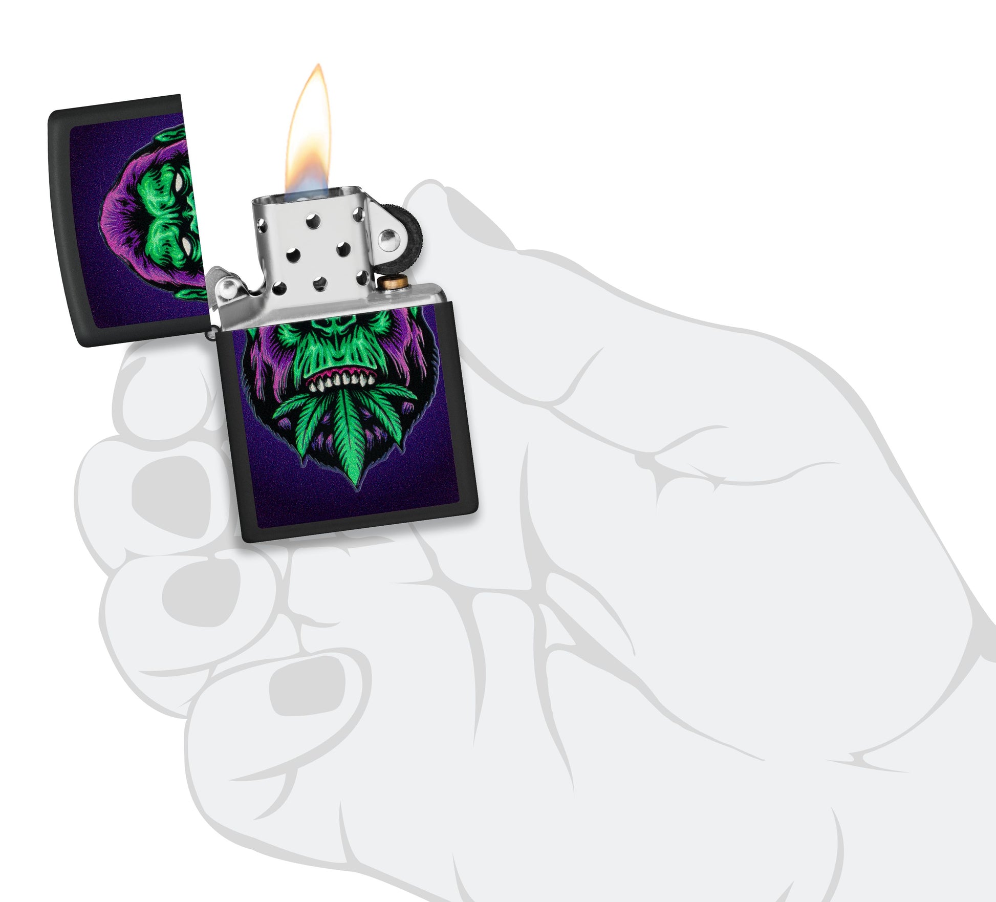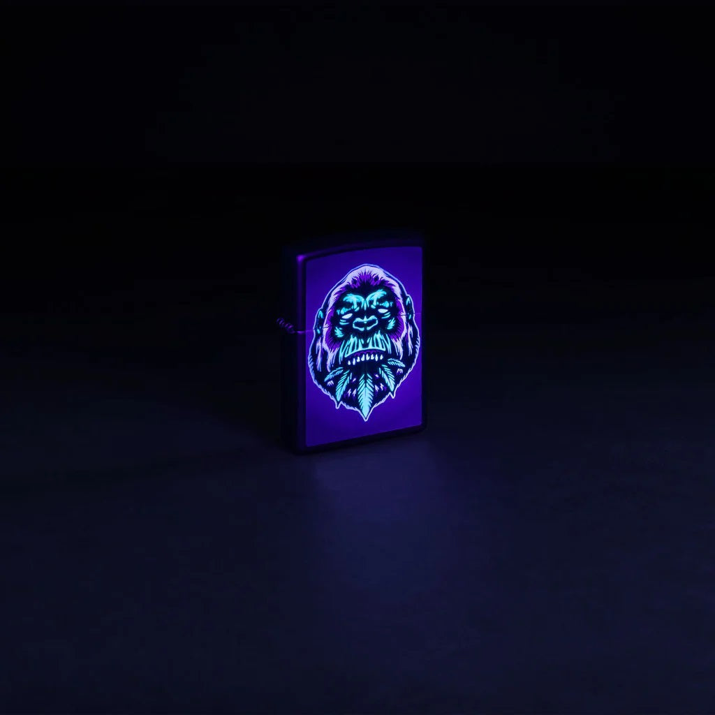 Ebben a megnyugtatóan szimmetrikus dizájnban egy gorilla legelészik egy kannabiszlevélen színes képalkotási eljárás segítségével. A matt fekete öngyújtó kontrasztos háttérként szolgál a dizájnhoz, amely ultraibolya fényben világít a szabadalmaztatott Black Light eljárásunknak köszönhetően. Díszdobozba csomagolva érkezik. Az optimális teljesítmény érdekében töltse fel Zippo öngyújtó töltőfolyadékkal.