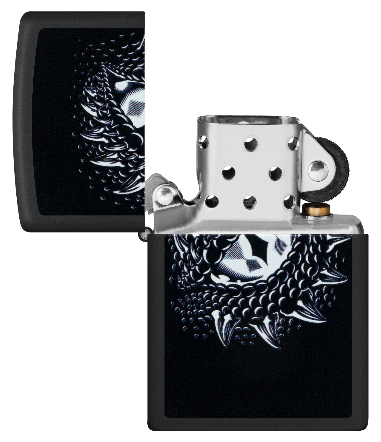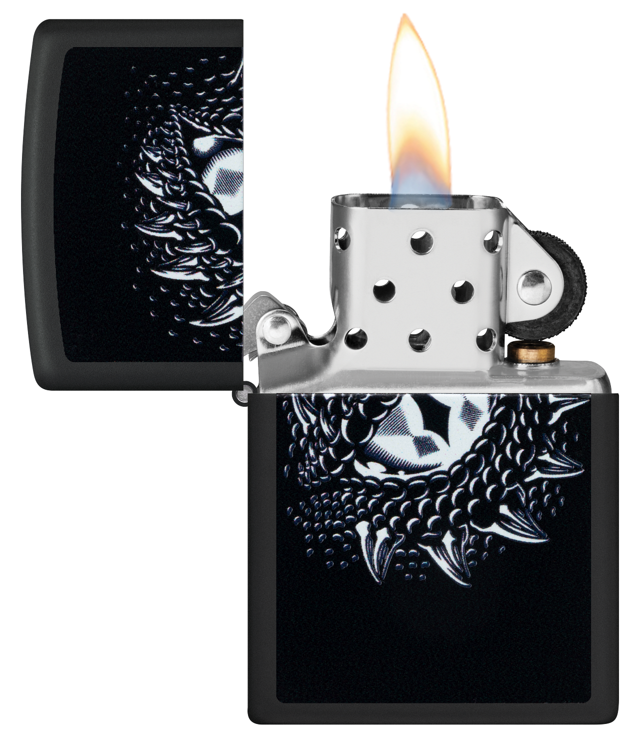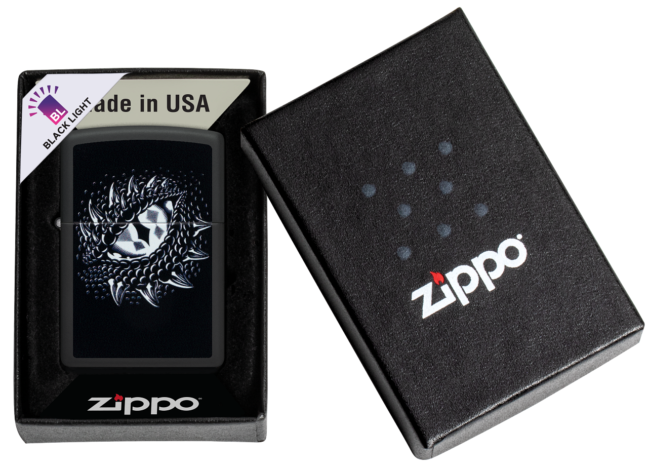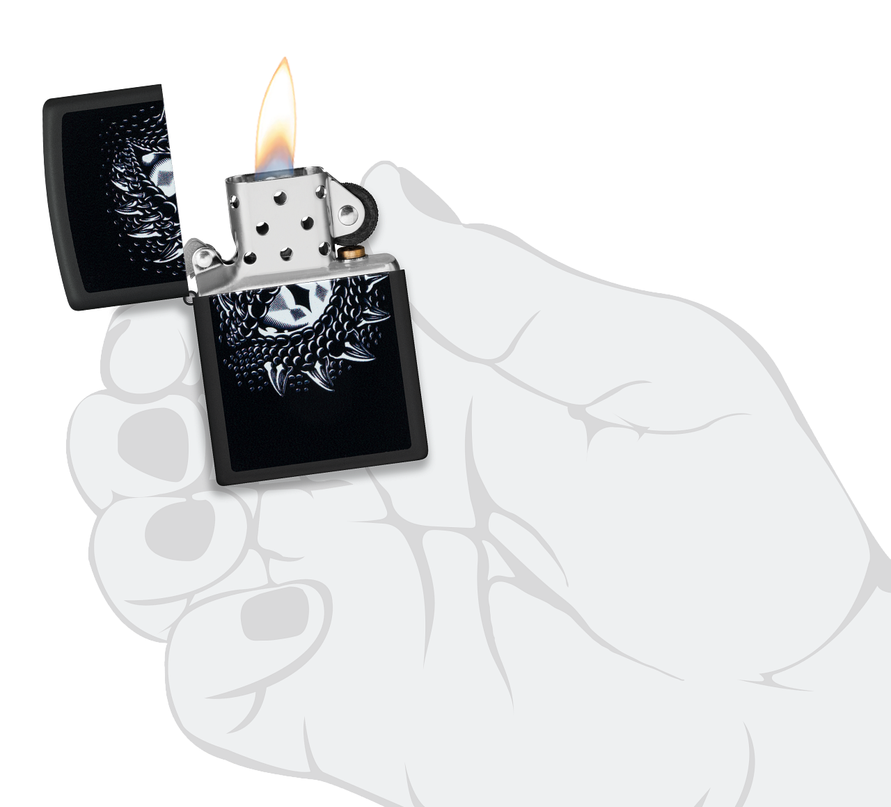 A lenyűgöző sárkányszem állandóan figyel ennek a matt fekete öngyújtónak a felületéről. Az éles Color Image dizájn ultraibolya fényben világít az exkluzív Black Light eljárásunknak köszönhetően. Díszdobozba csomagolva érkezik. Az optimális teljesítmény érdekében töltse fel Zippo öngyújtó töltőfolyadékkal.