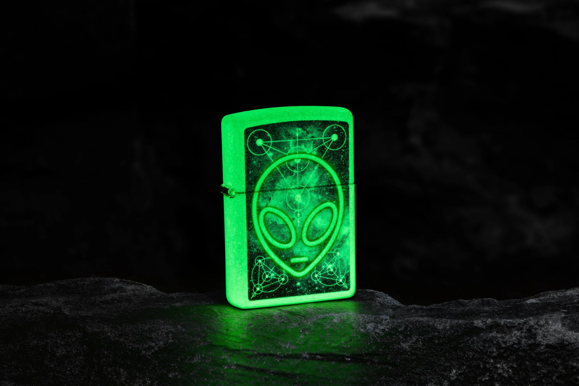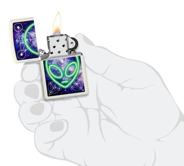 Egy lenyűgöző galaxis háttérből tűnik fel egy ragyogó földönkívüli fej ezen a klasszikus, sötétben világító öngyújtón, egy földöntúli hangulatú Color Image dizájnban. Díszdobozba csomagolva érkezik. Az optimális teljesítmény érdekében töltse fel Zippo öngyújtó töltőfolyadékkal.